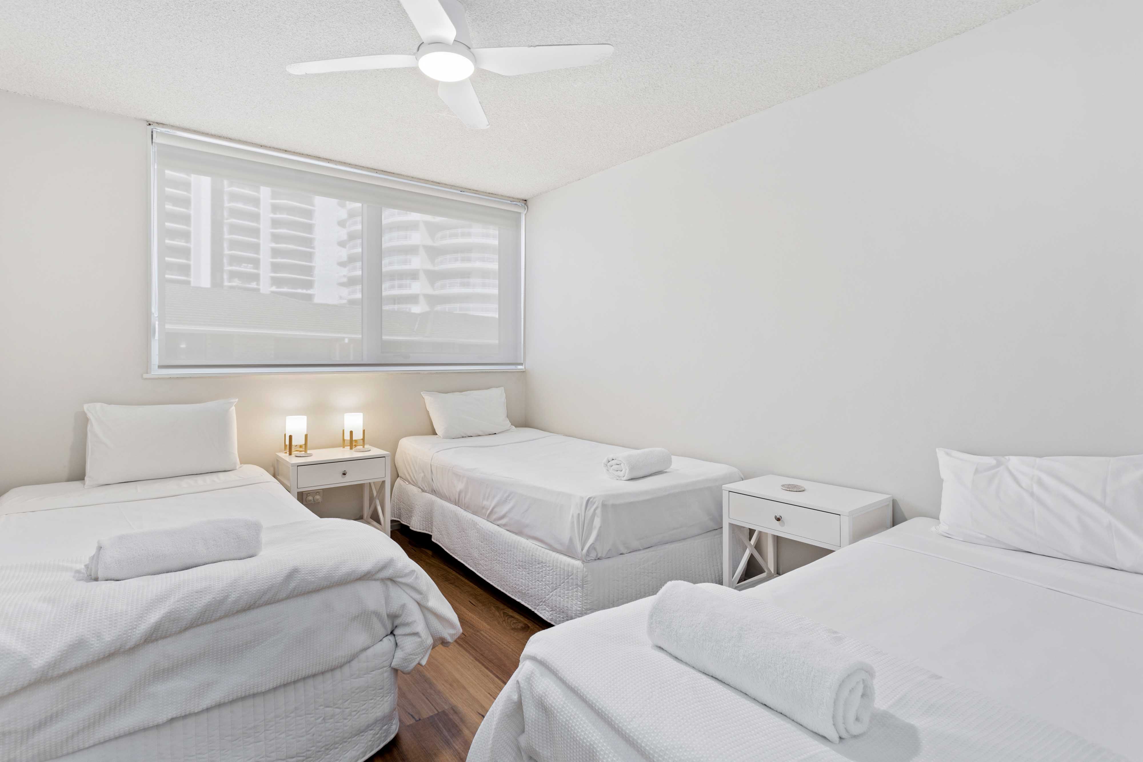 The Apartment Features 1 x Queen Bed with Ensuite shower, 1 x Double Bed in Bedroom 2, and 3 x Single Beds in the Third Bedroom.