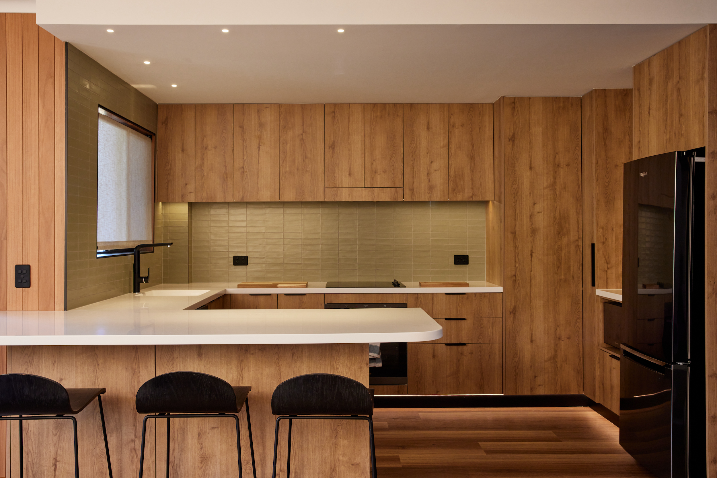 The recently renovated kitchen is a chef’s delight, featuring wooden cabinetry, modern appliances, and dramatic built-in lighting. Whip up gourmet meals with ease and dine in style at the breakfast bar and enjoy on the balcony looking out towards the ocean.
