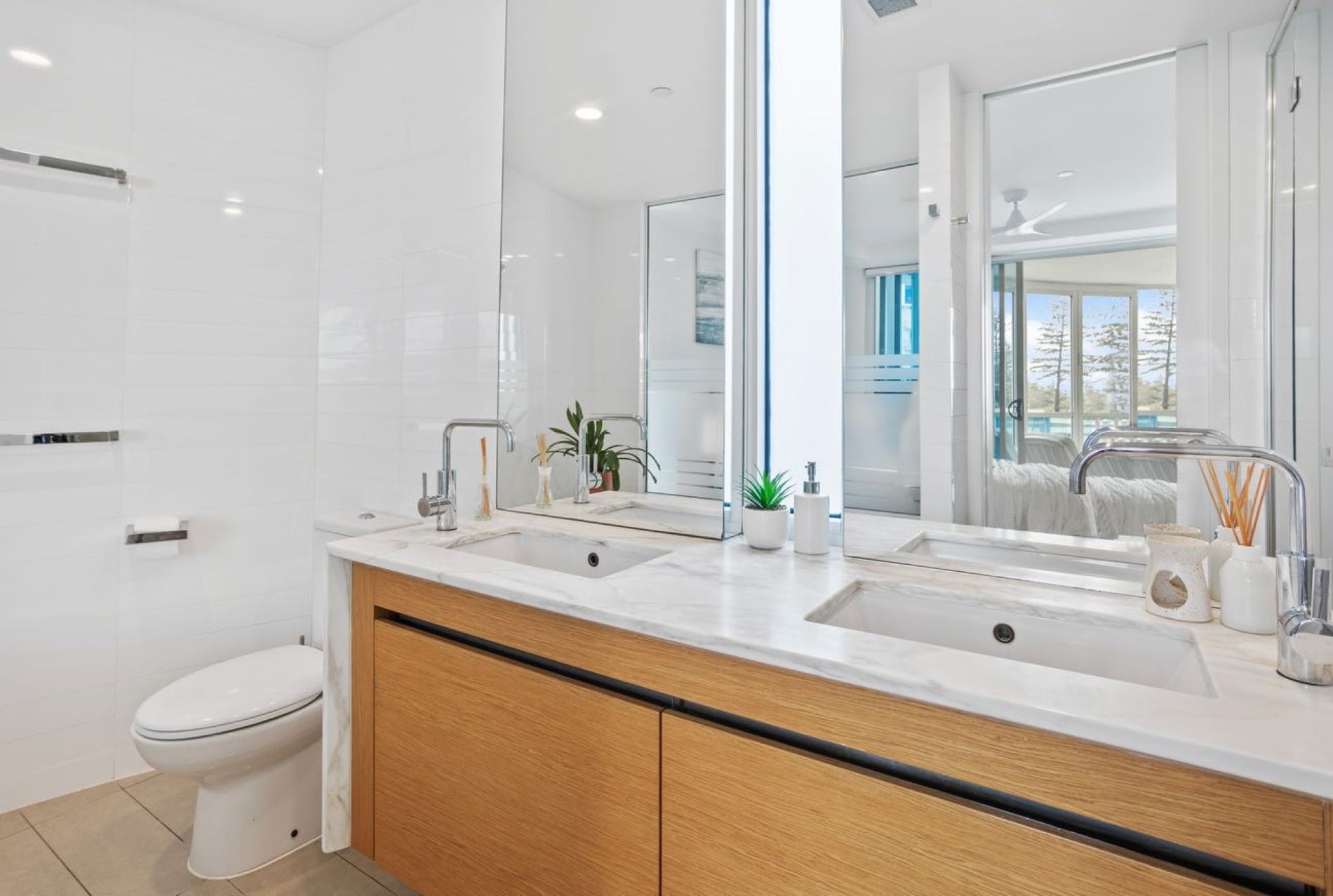 The apartment is equipped with ducted air conditioning and ceiling fans throughout, ensuring comfort in every season. The space offers a coastal touch with all the modern amenities for a relaxing stay. A smart laundry, including a front-load tumble dryer, adds convenience for longer stays.